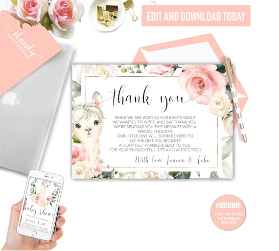 Llama Baby Shower Thank You Card Printable Thank You Card