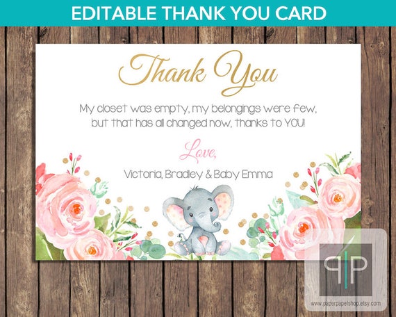 Instant Download Elephant Baby Shower Thank You Card Etsy